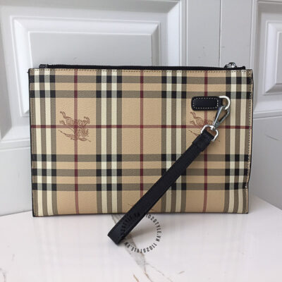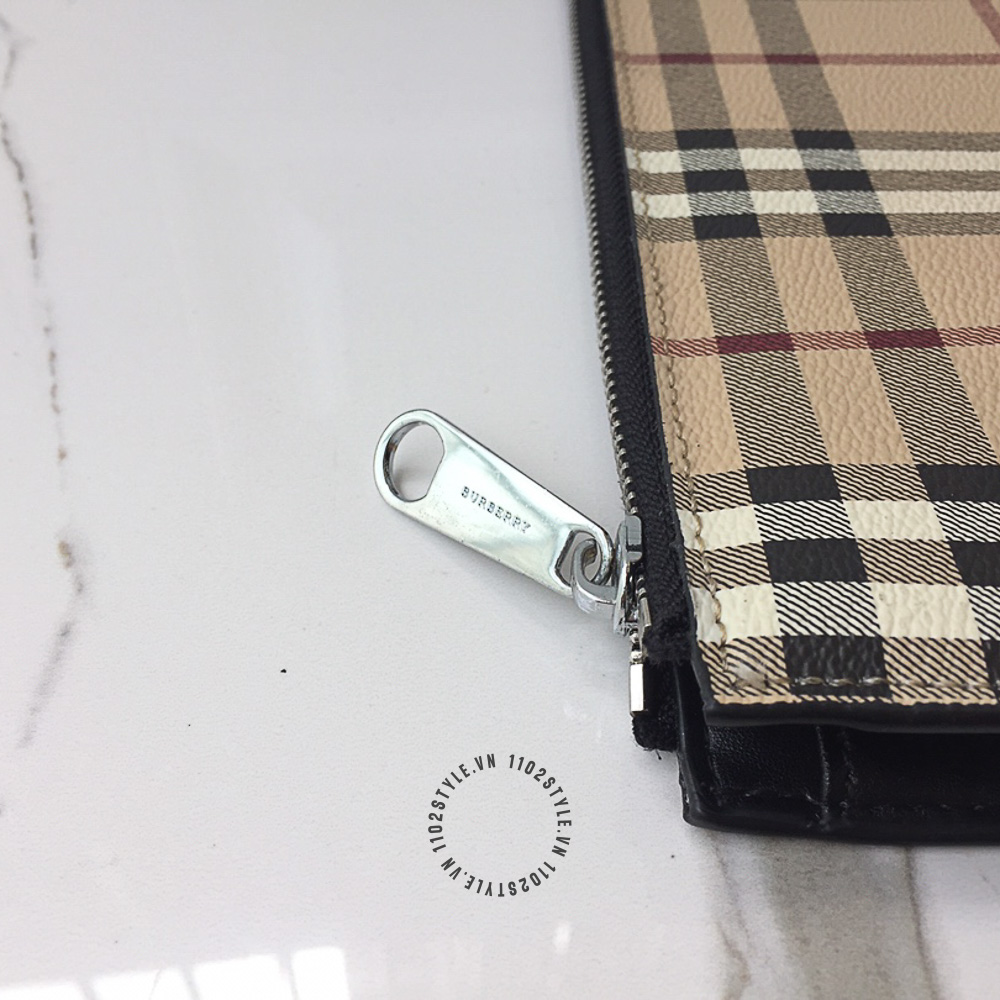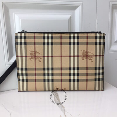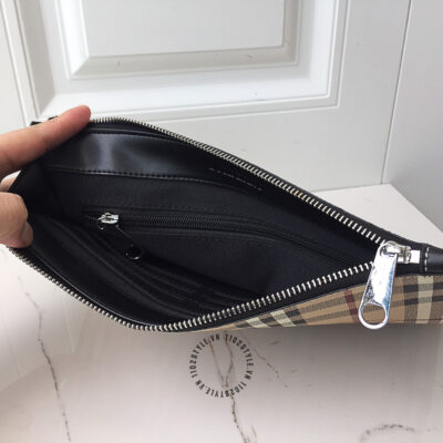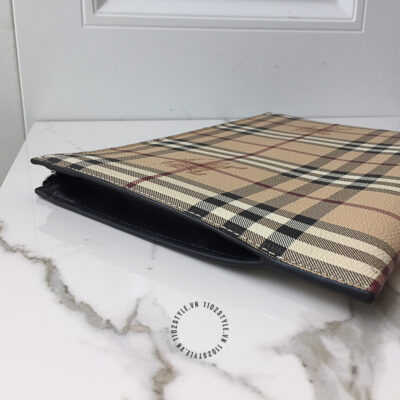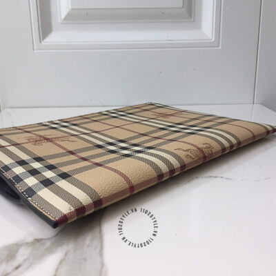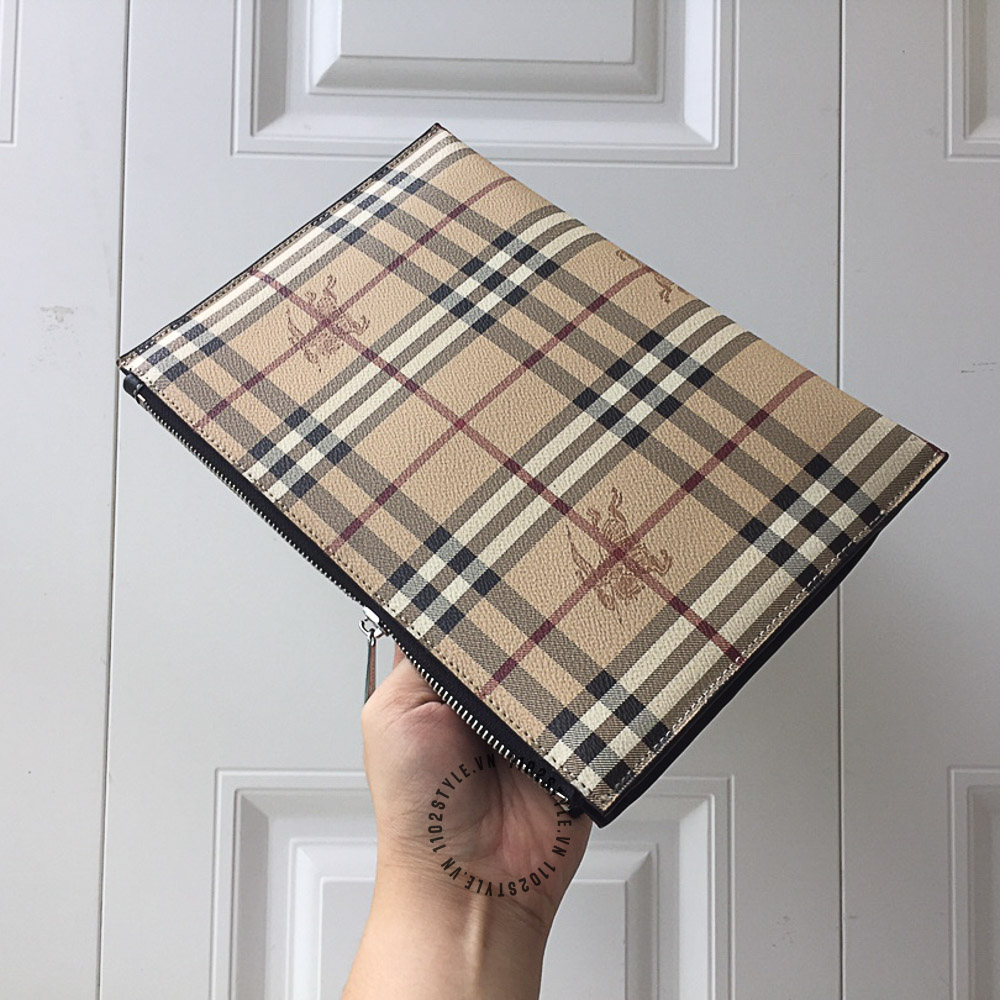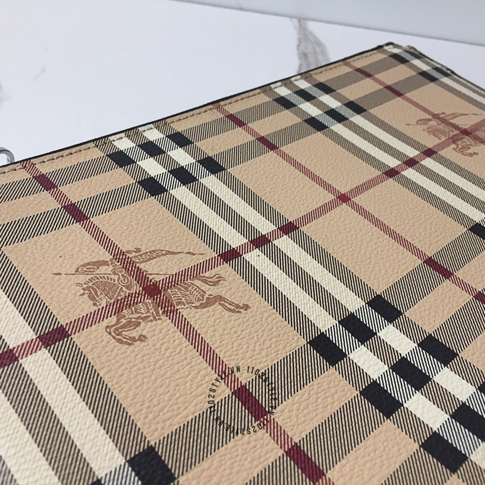 Hình ảnh chi tiết clutch Burberry màu nâu kẻ sọc họa tiết kỵ sĩ cưỡi ngựa cao cấp: