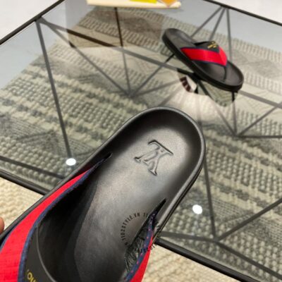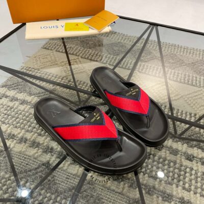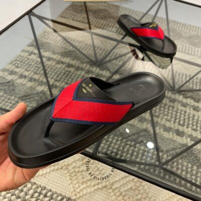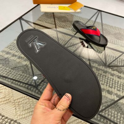 Hình ảnh chi tiết dép LV nam xỏ ngón màu đen quai đỏ replica 1:1 chính hãng: