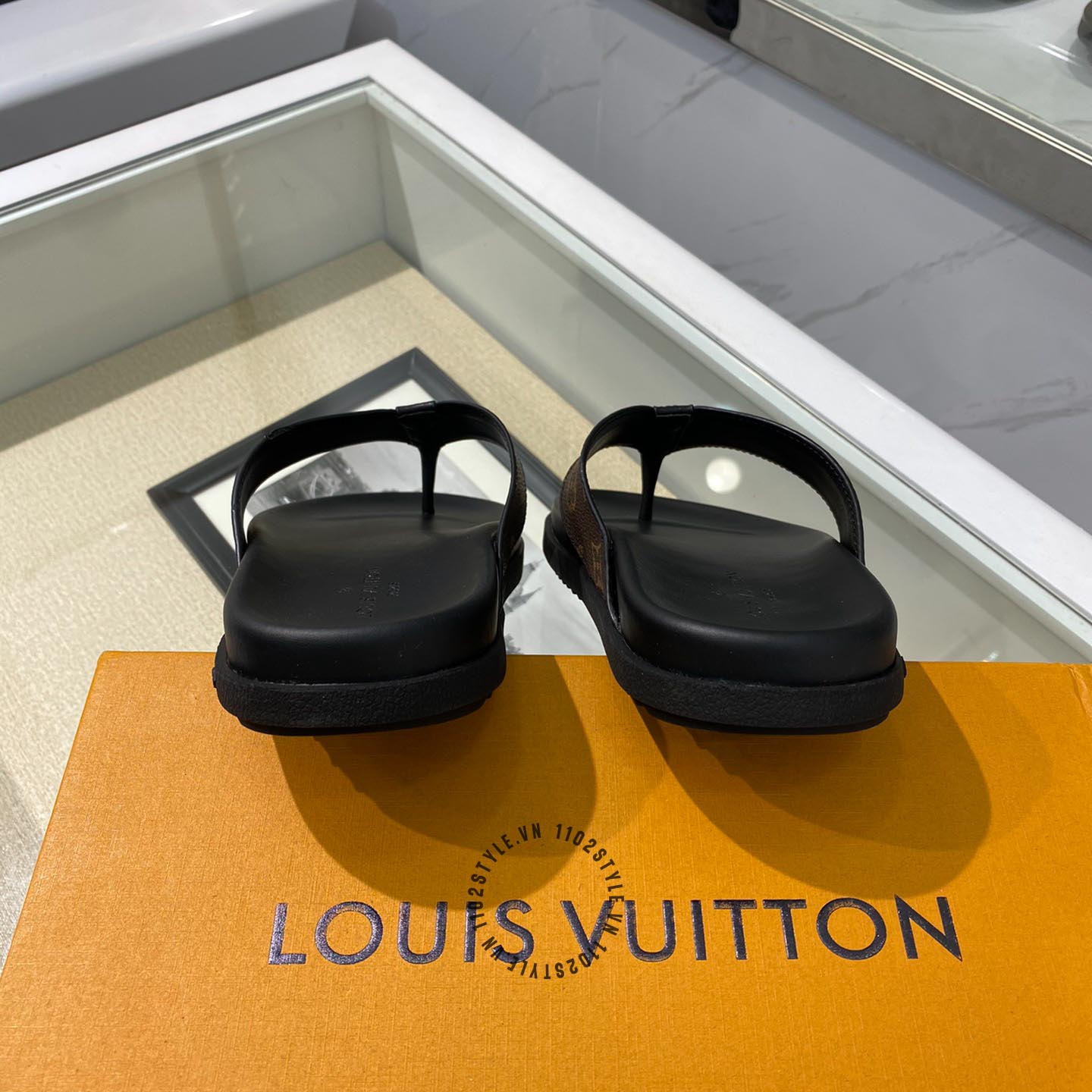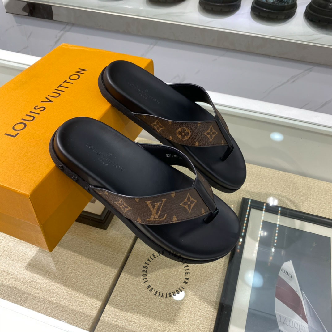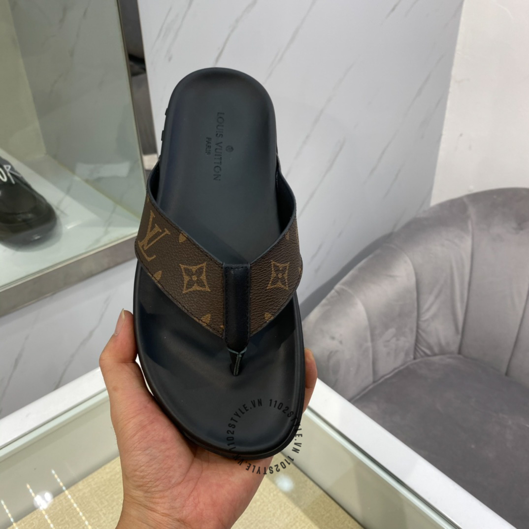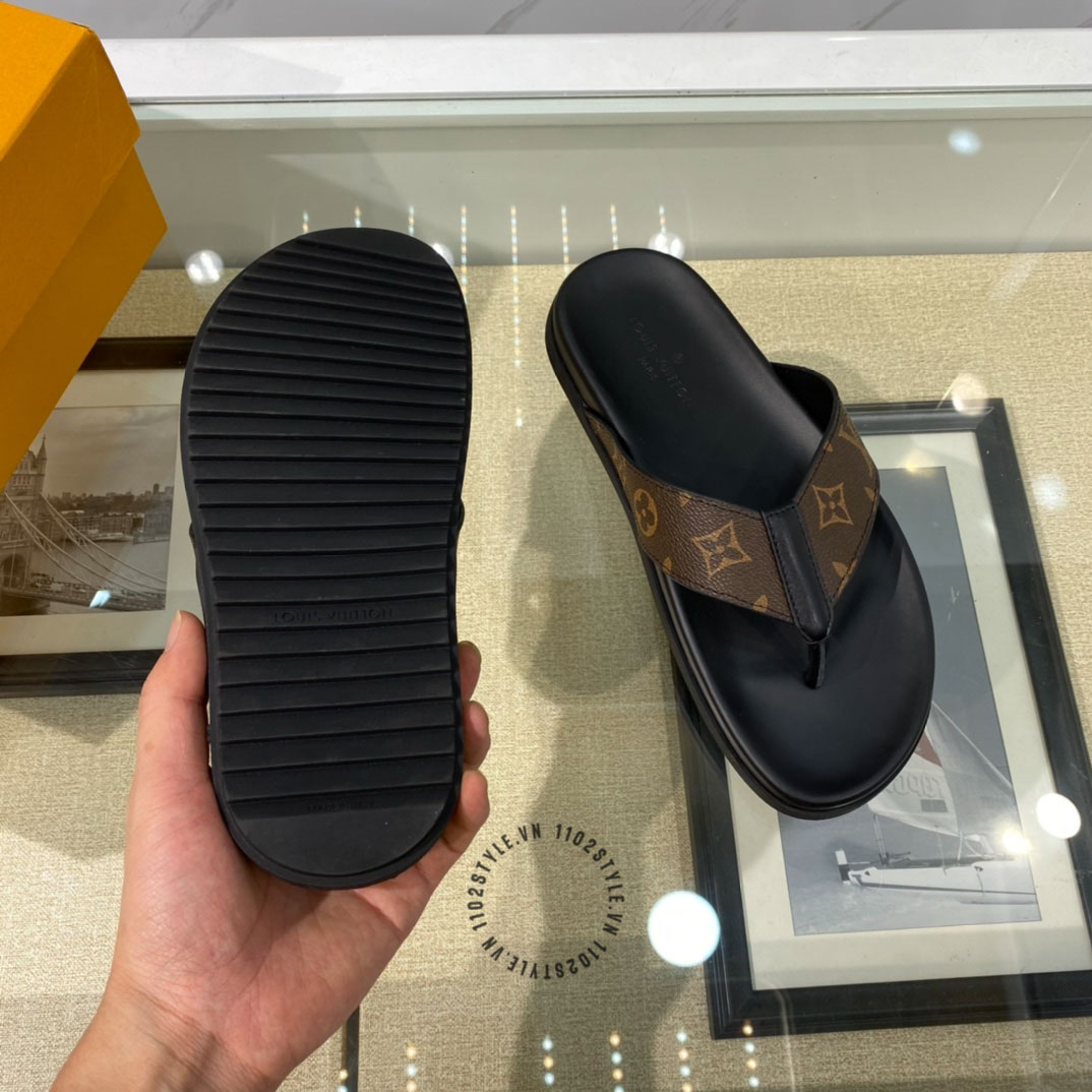 Ảnh chi tiết dép LV xỏ ngón da xịn màu đen quai nâu phối họa tiết fake 1:1: