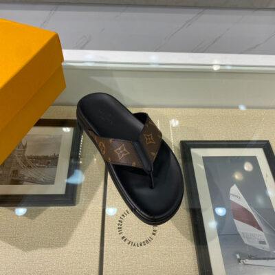 Ảnh chi tiết dép LV xỏ ngón da xịn màu đen quai nâu phối họa tiết fake 1:1: