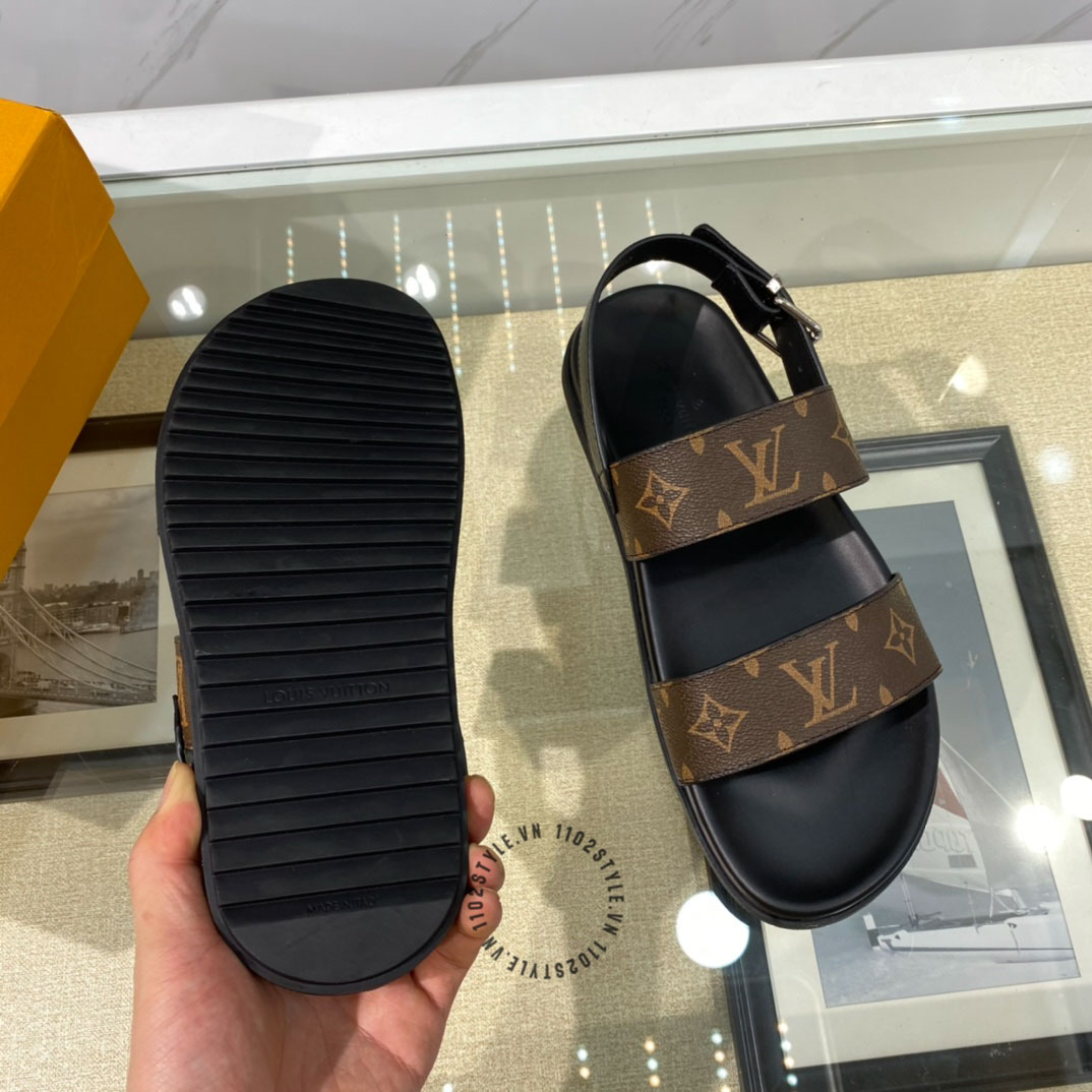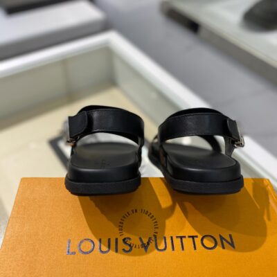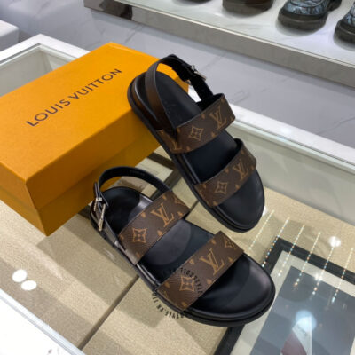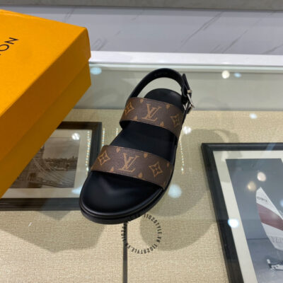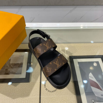 Hình ảnh mô tả dép sandal LV replica 1:1 chính hãng màu đen quai nâu họa tiết: