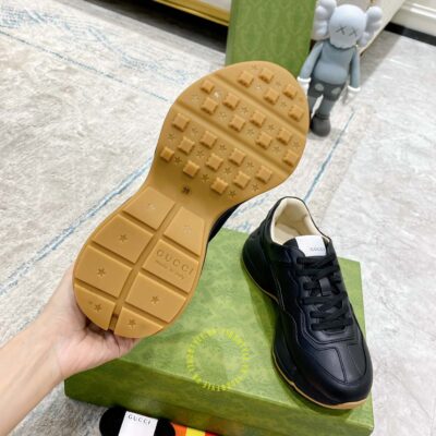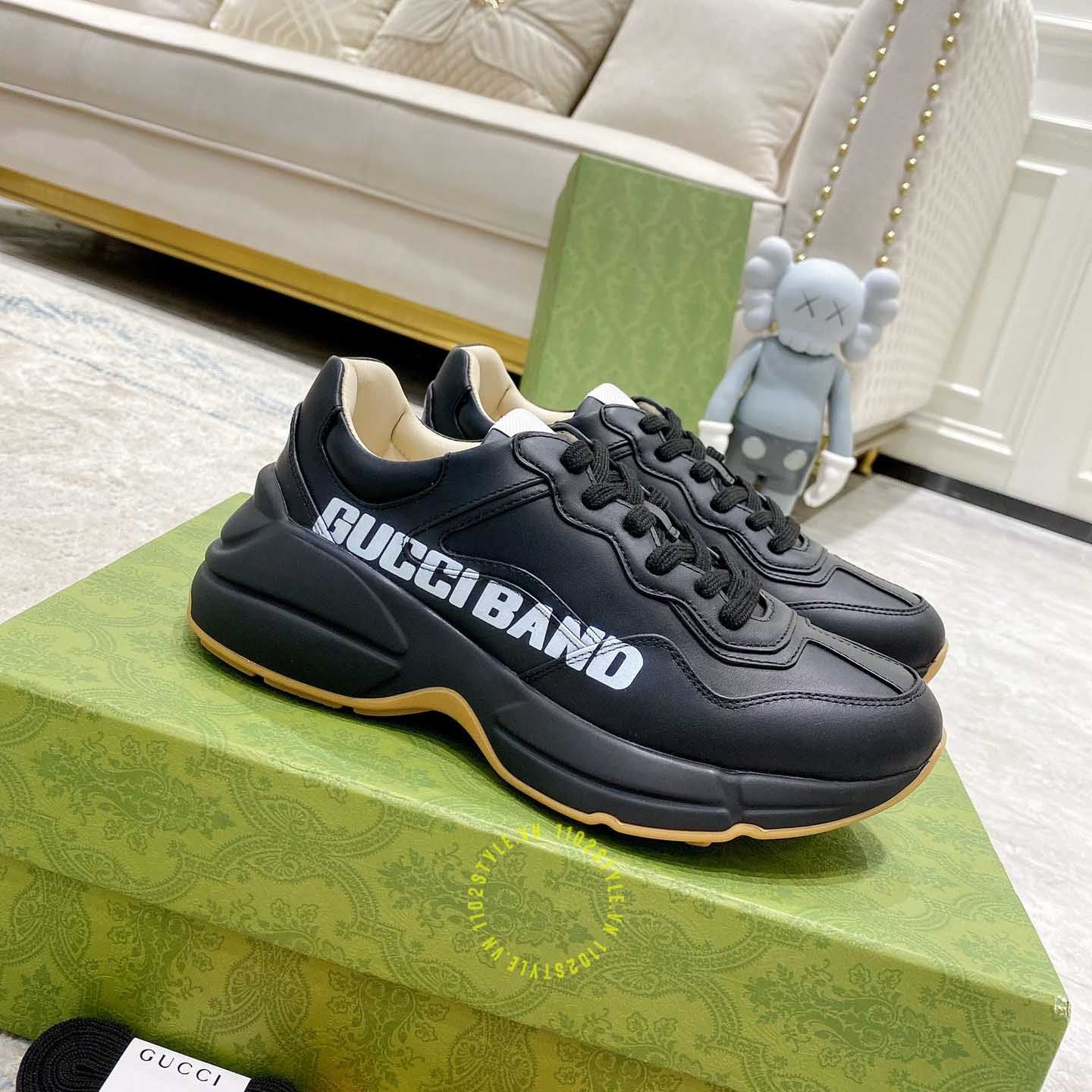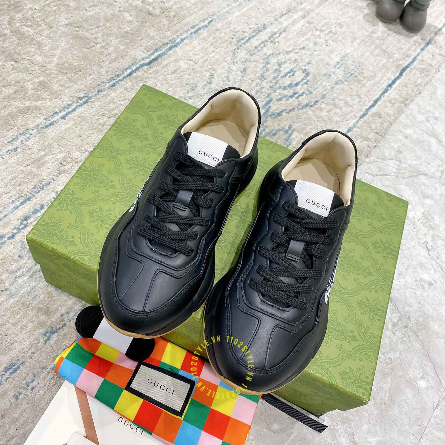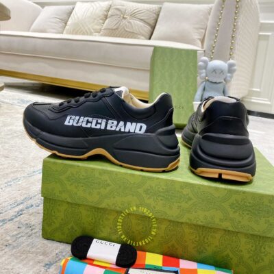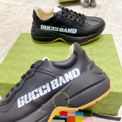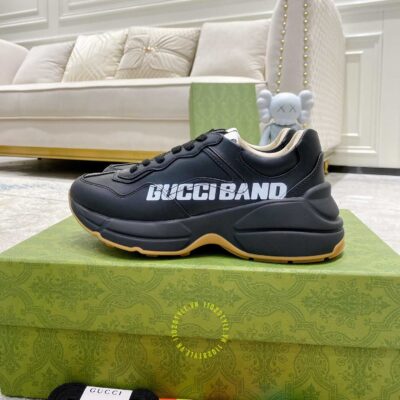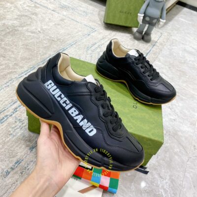 Ảnh mô tả giày da nam hàng hiệu Gucci màu đen hoạ tiết chữ trắng: