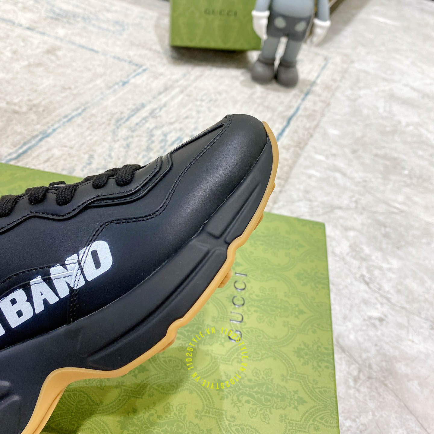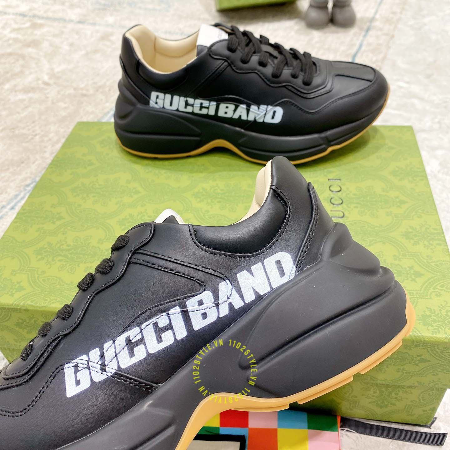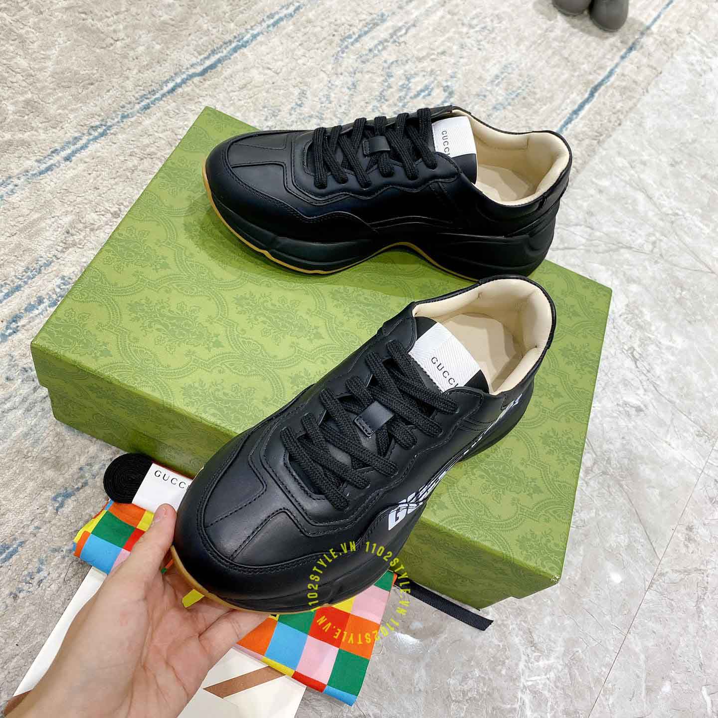 Ảnh mô tả giày da nam hàng hiệu Gucci màu đen hoạ tiết chữ trắng: