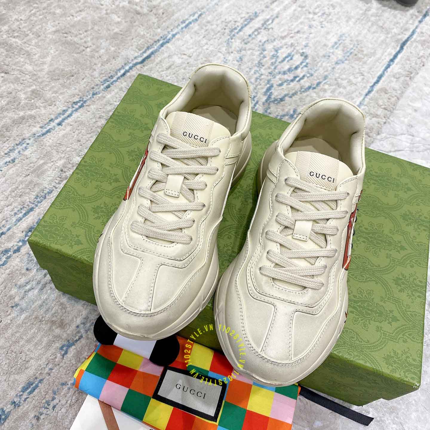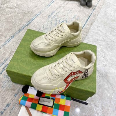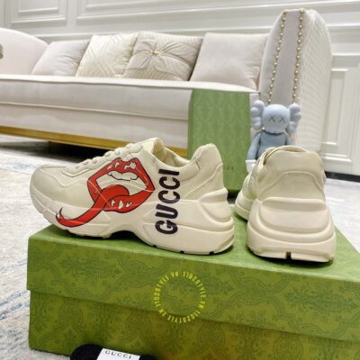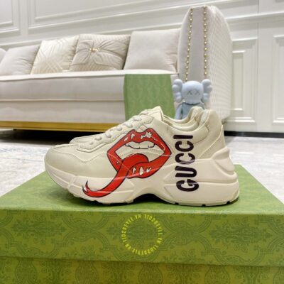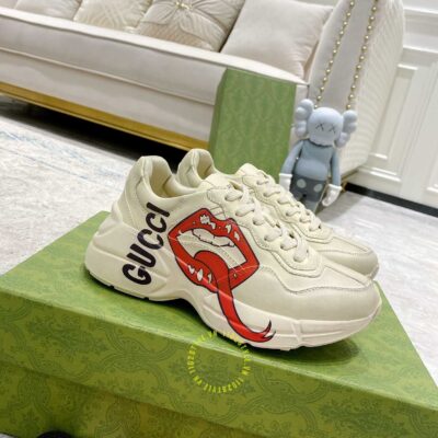 Ảnh mô tả giày da nam hàng hiệu Gucci màu trắng hoạ tiết môi: