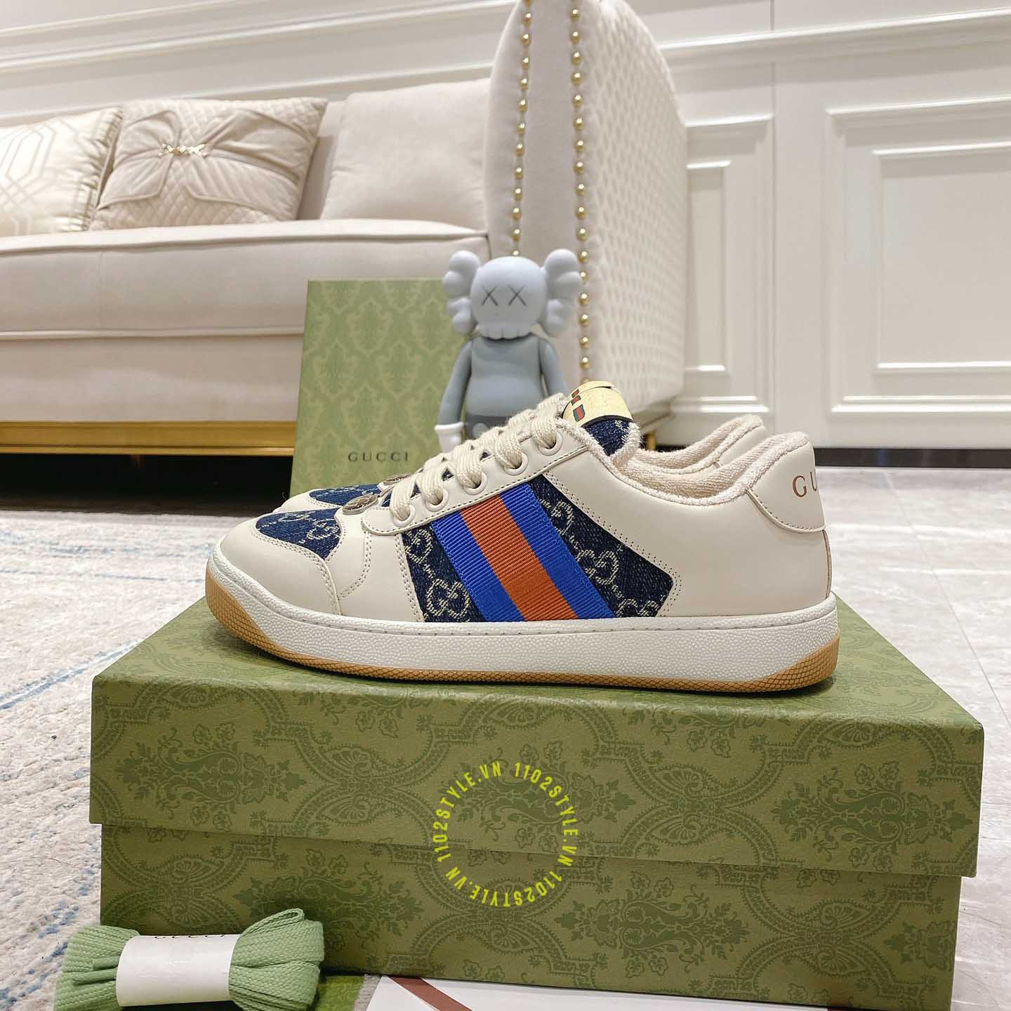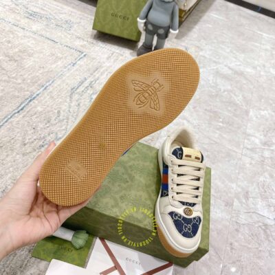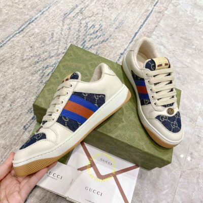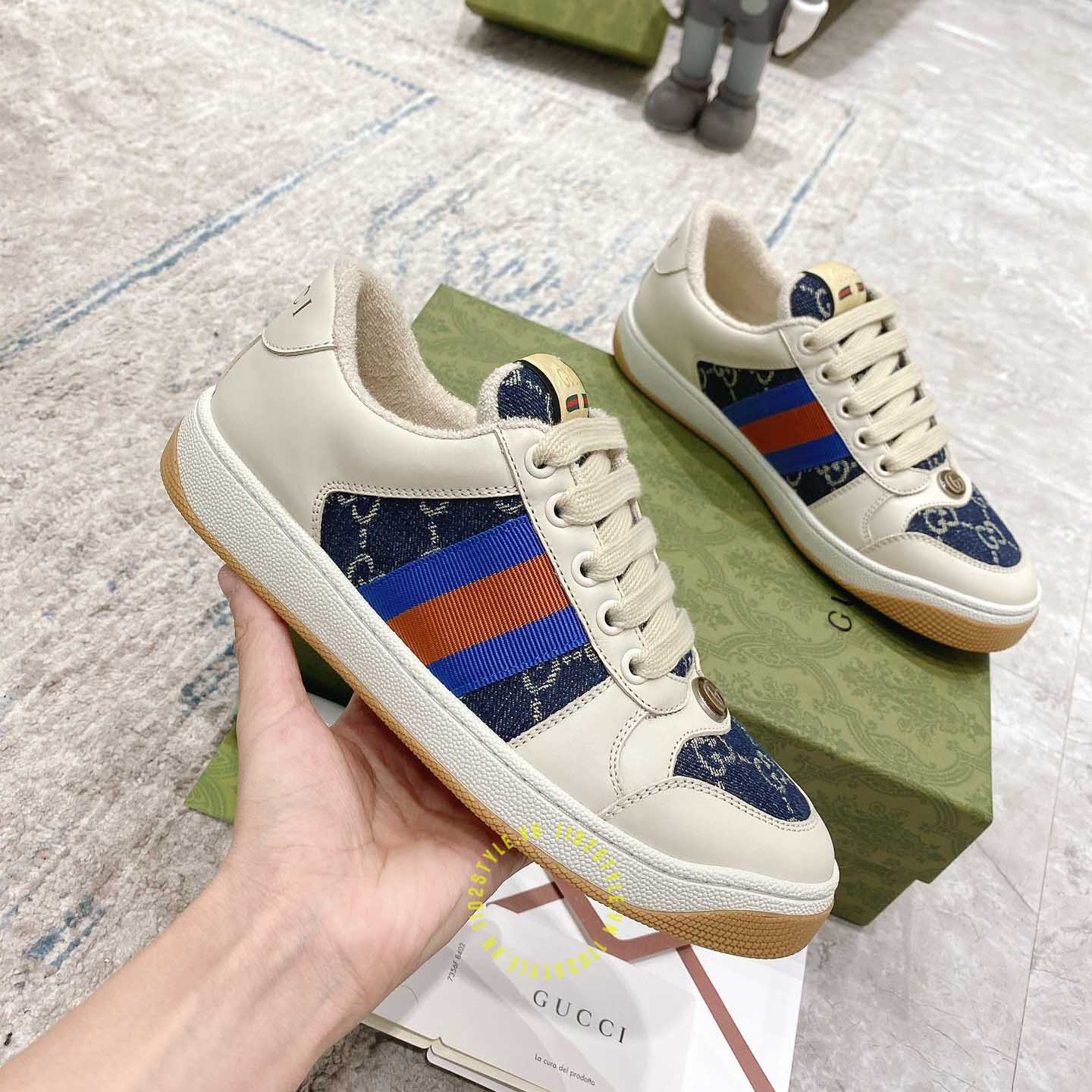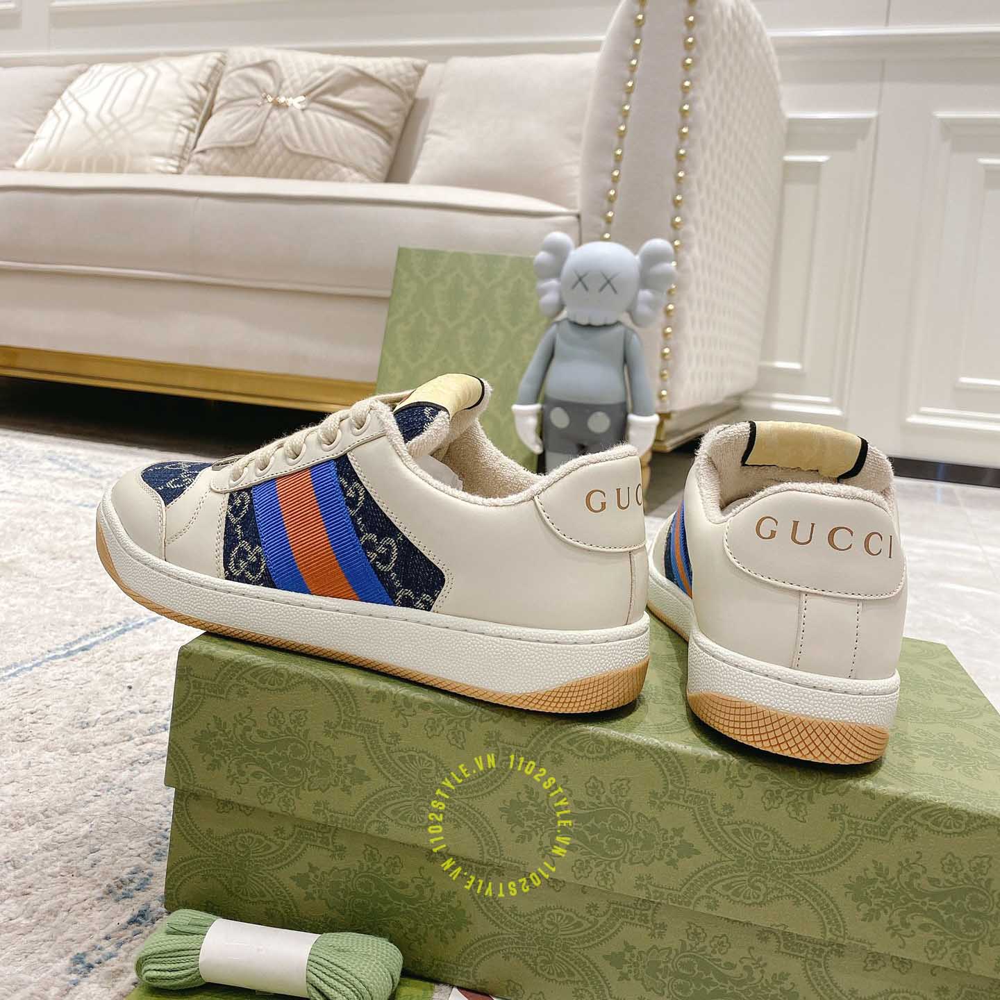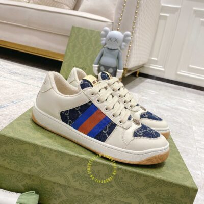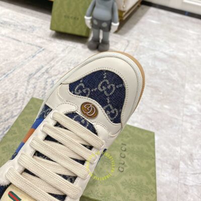 Hình ảnh chi tiết giày Gucci Sneaker nam nữ hàng hiệu da xịn màu be phối vải Denim: