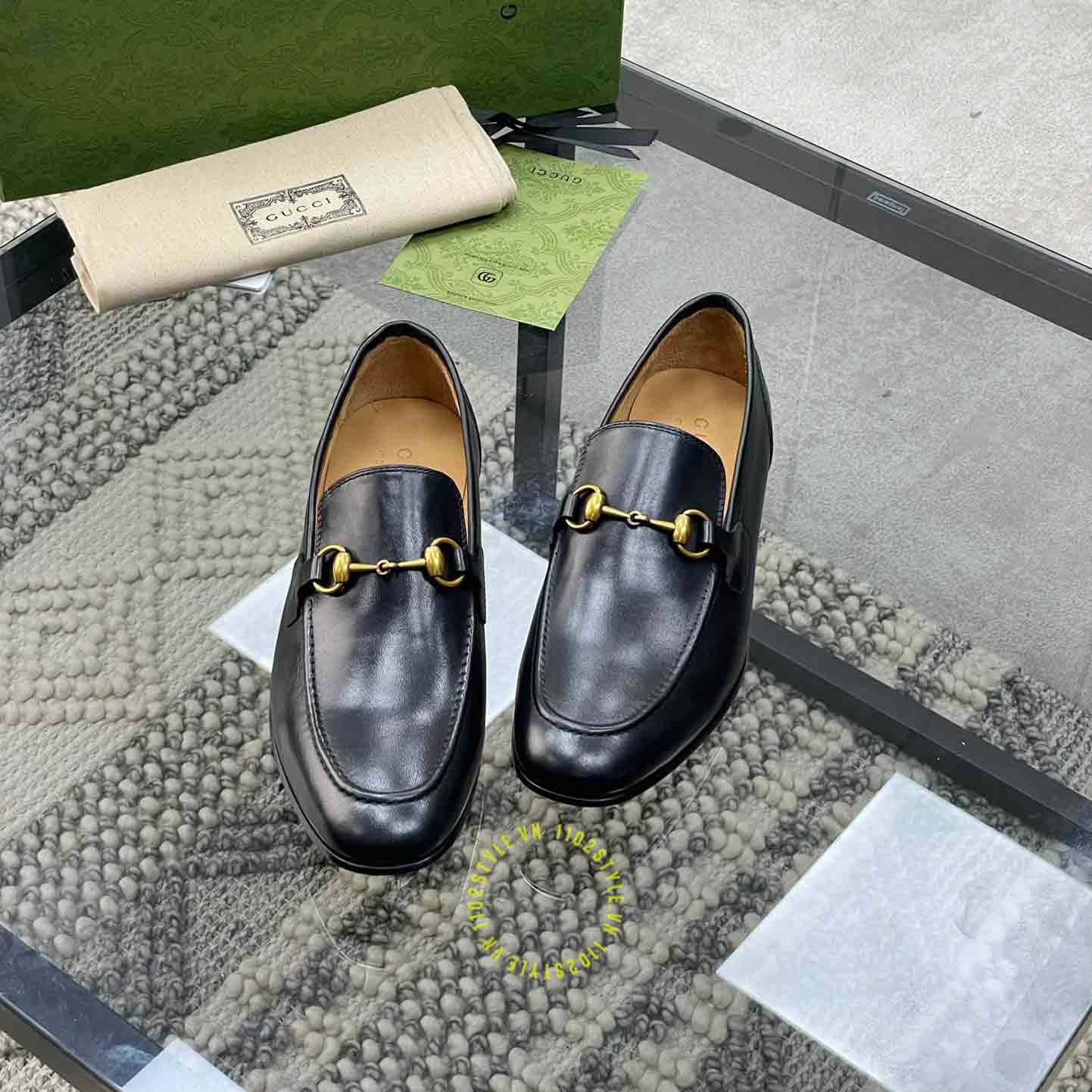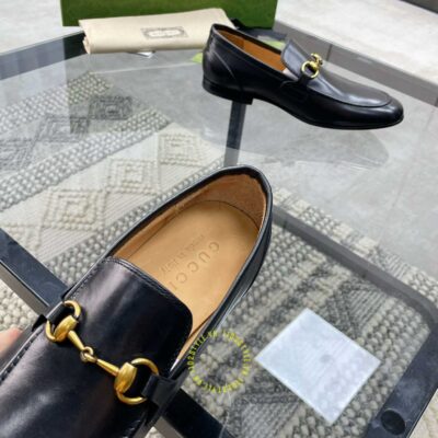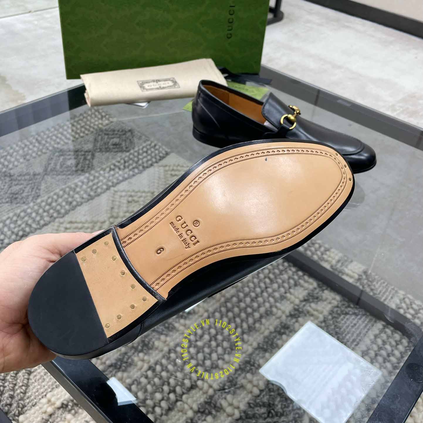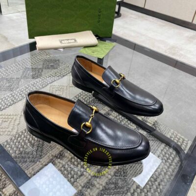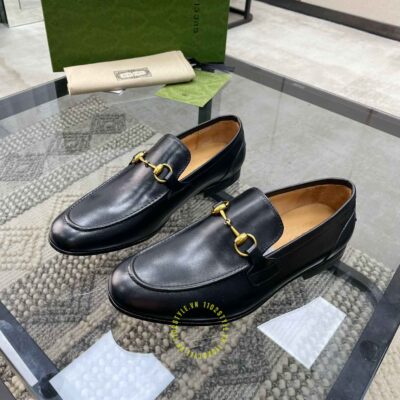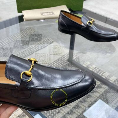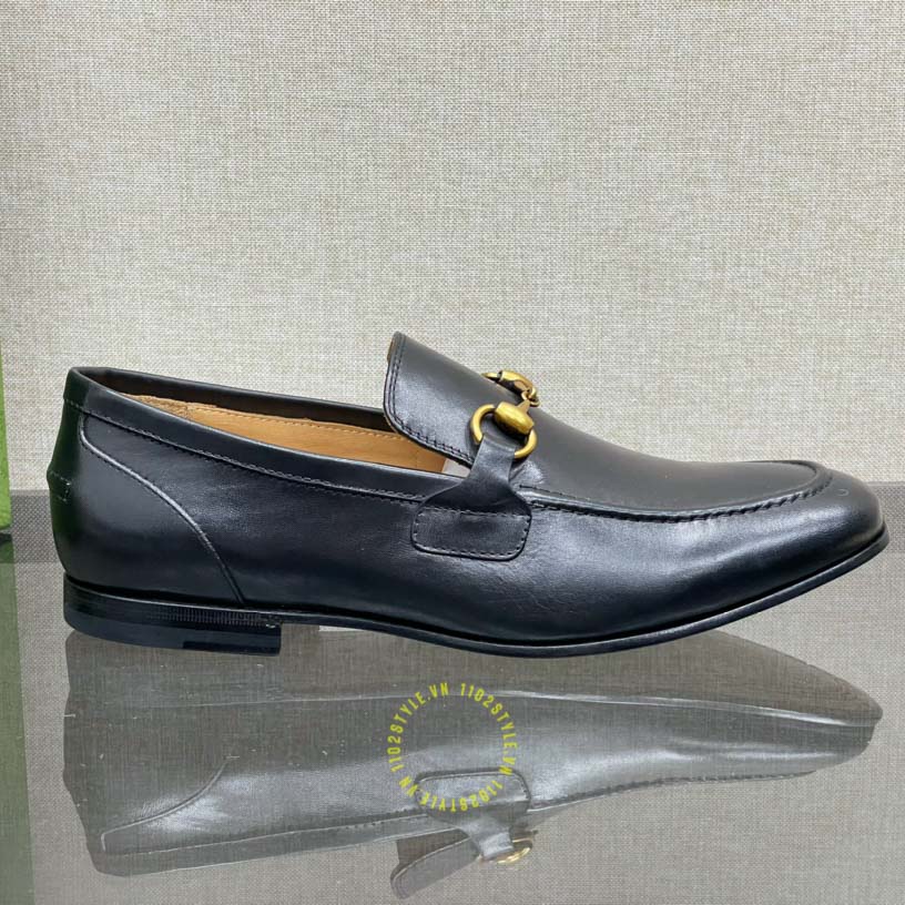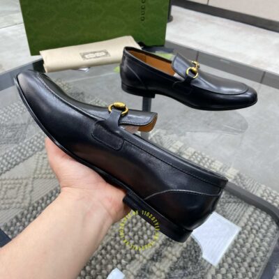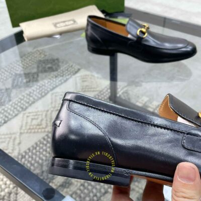 Hình ảnh chi tiết giày lười nam hàng hiệu Gucci da đen trơn logo vàng: