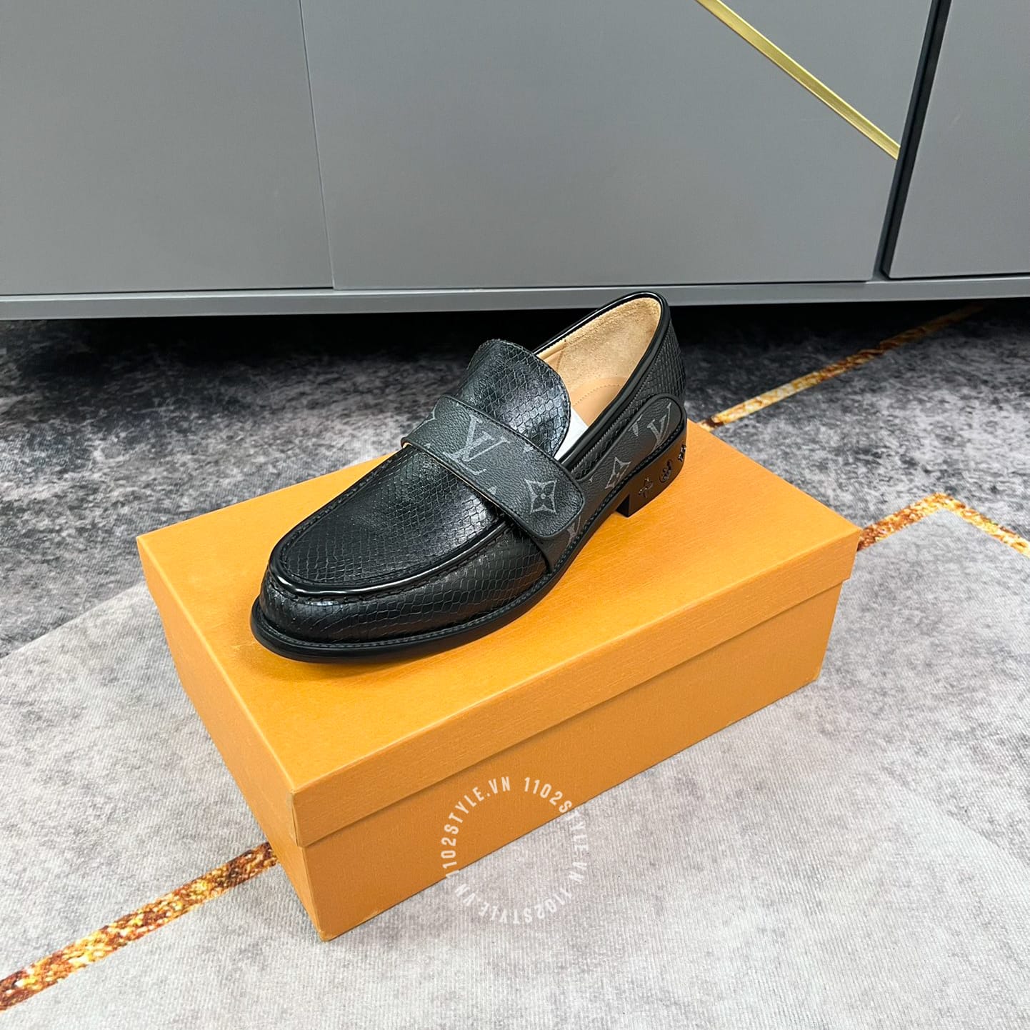2. Review chi tiết về giày lười nam LV màu đen họa tiết Monogram siêu cấp