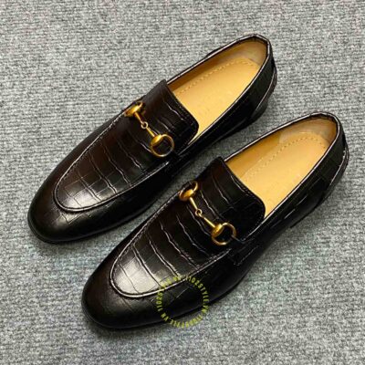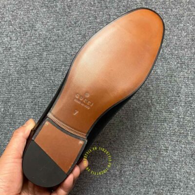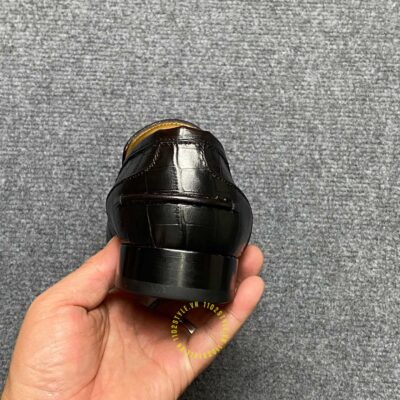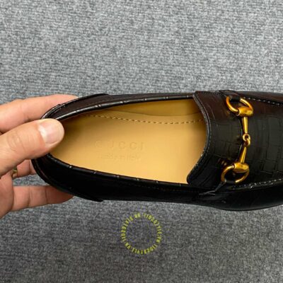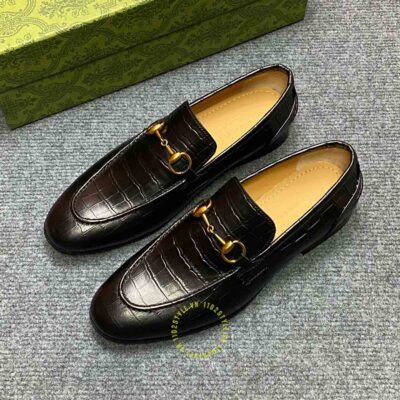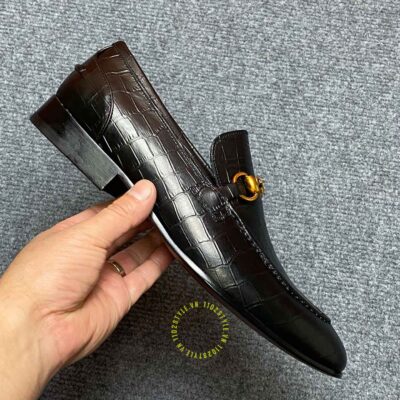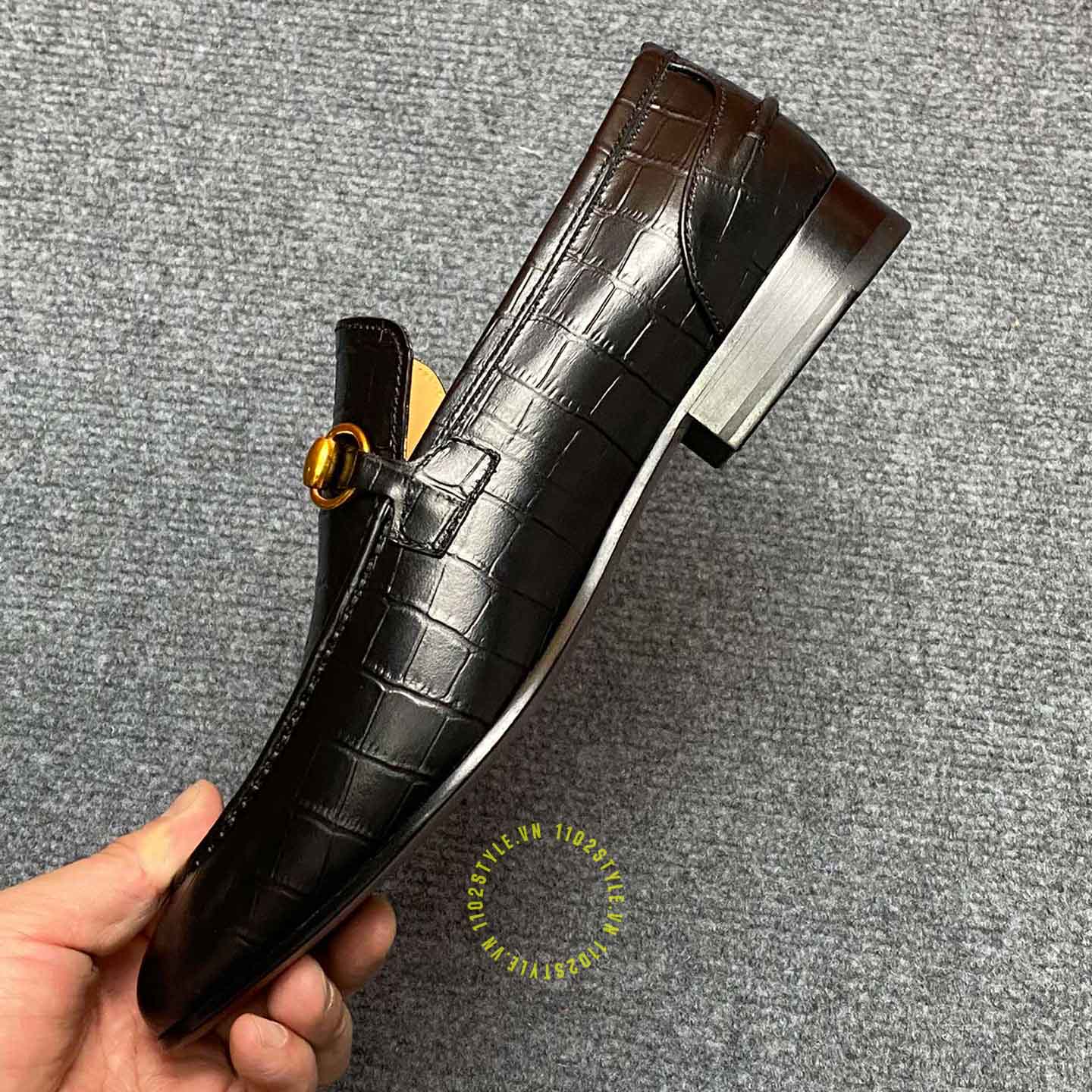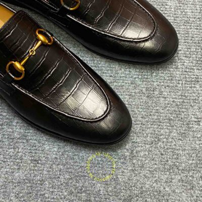 Ảnh chi tiết giày nam hàng hiệu Gucci Loafer da xịn màu đen vân cá sấu: