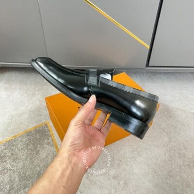 Giày lười hàng hiệu Louis Vuitton với màu chủ đạo chính là màu đen – mang lại cảm giác bí ẩn nhưng không kém phần mạnh mẽ. Phần cổ giày tô điểm bằng màu ghi, đen xen tạo nên bố cục màu sắc hài hòa.
