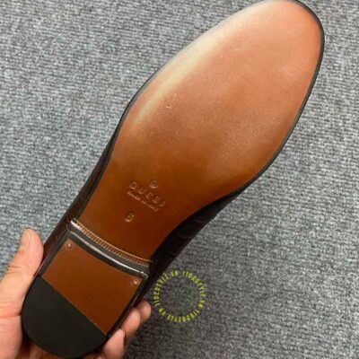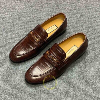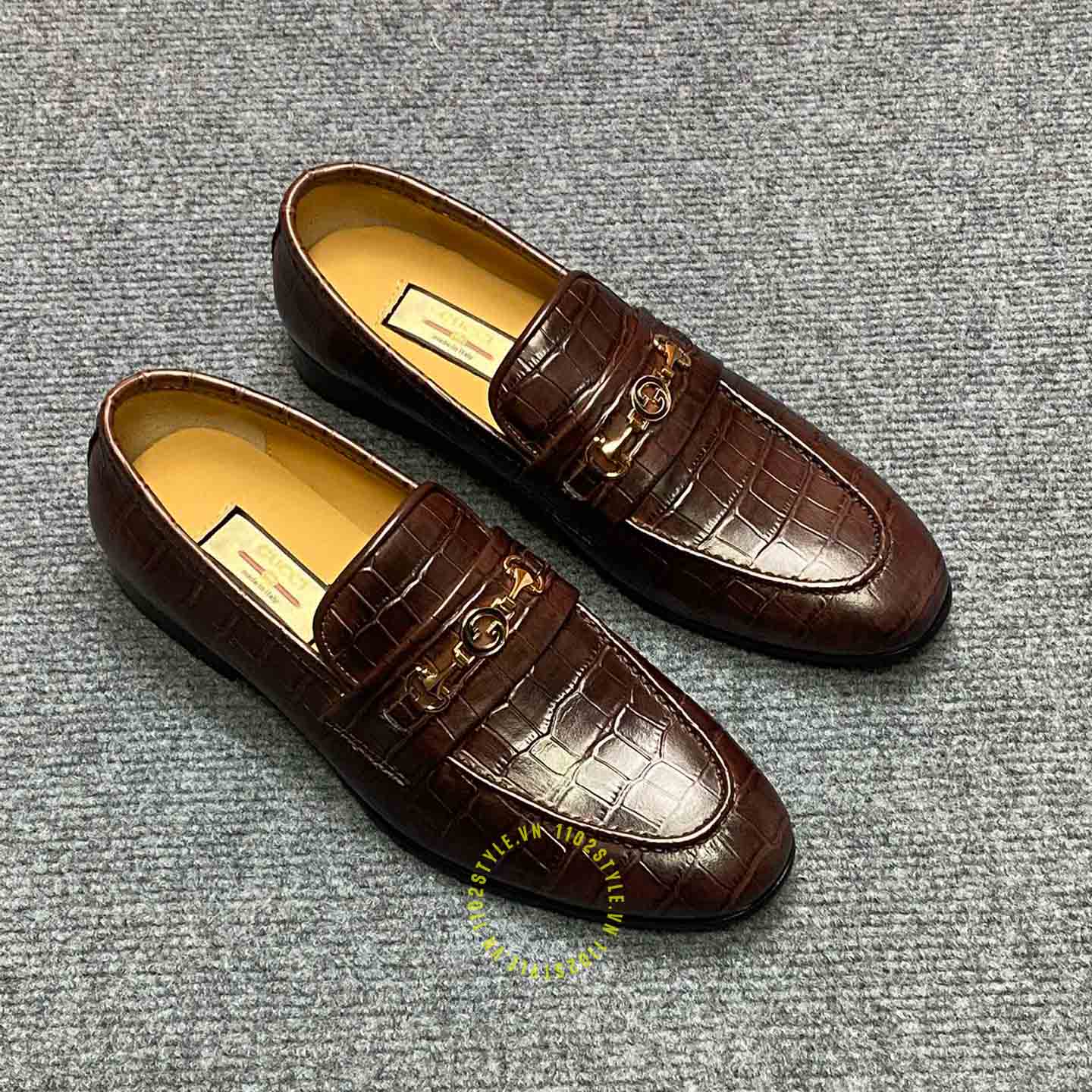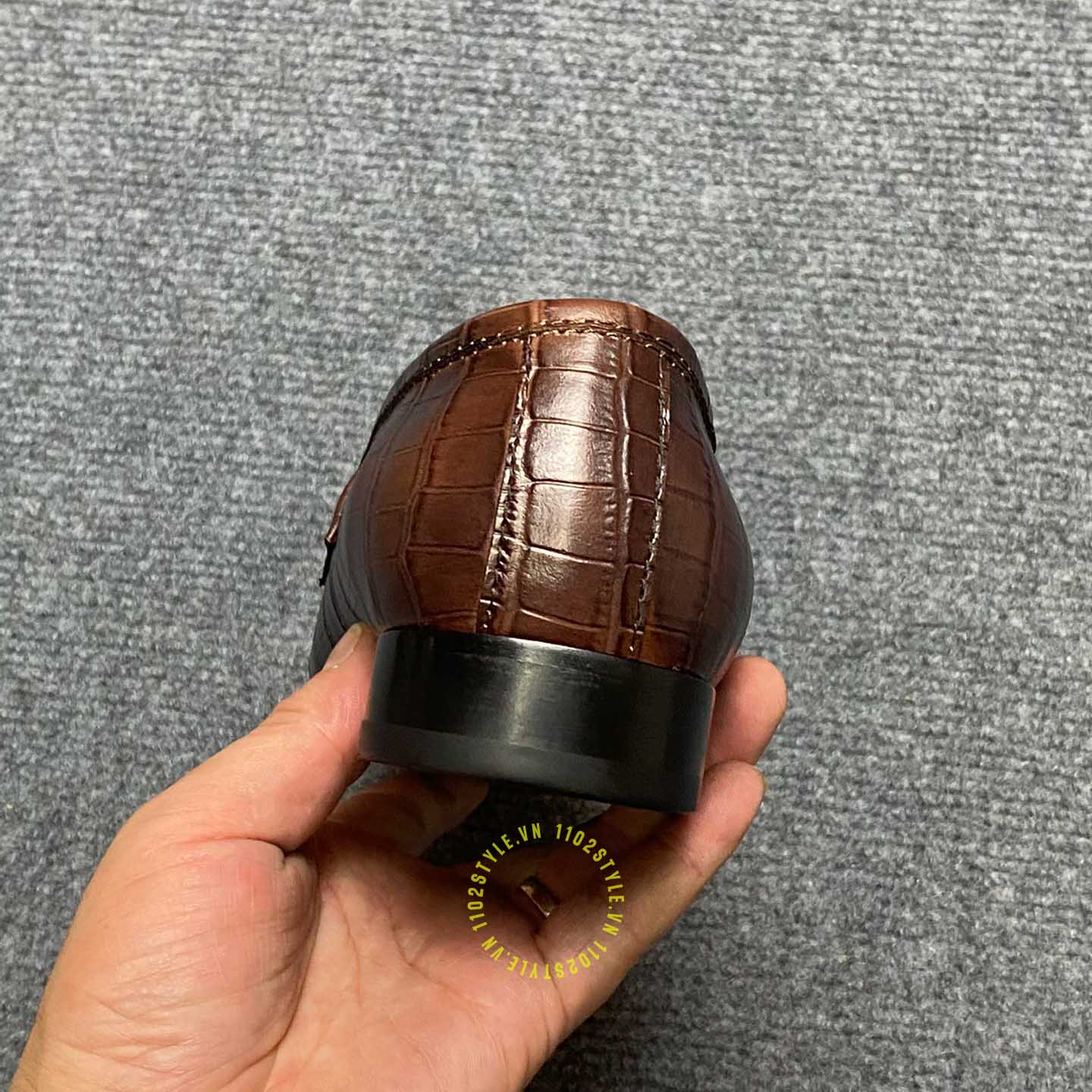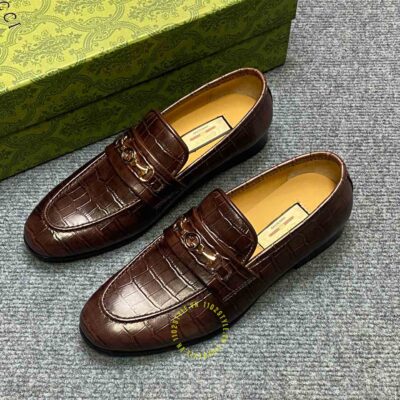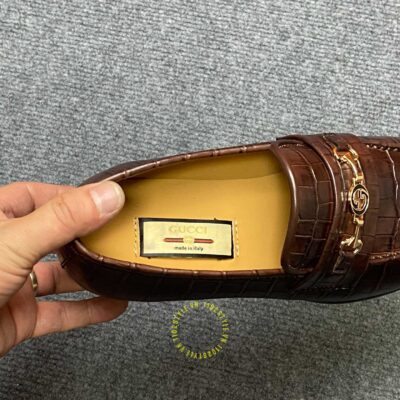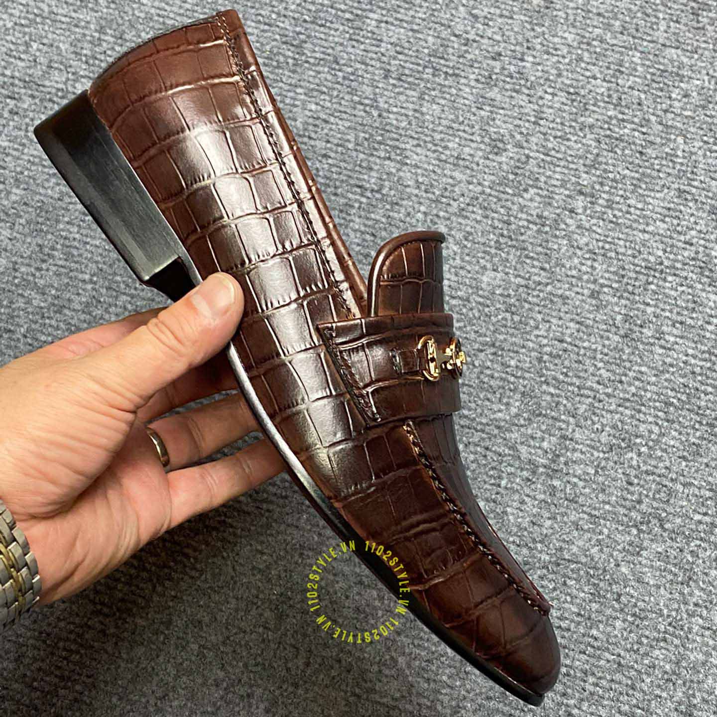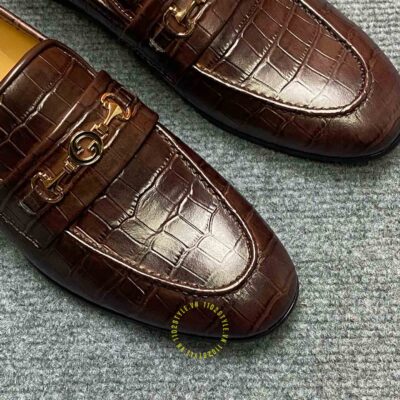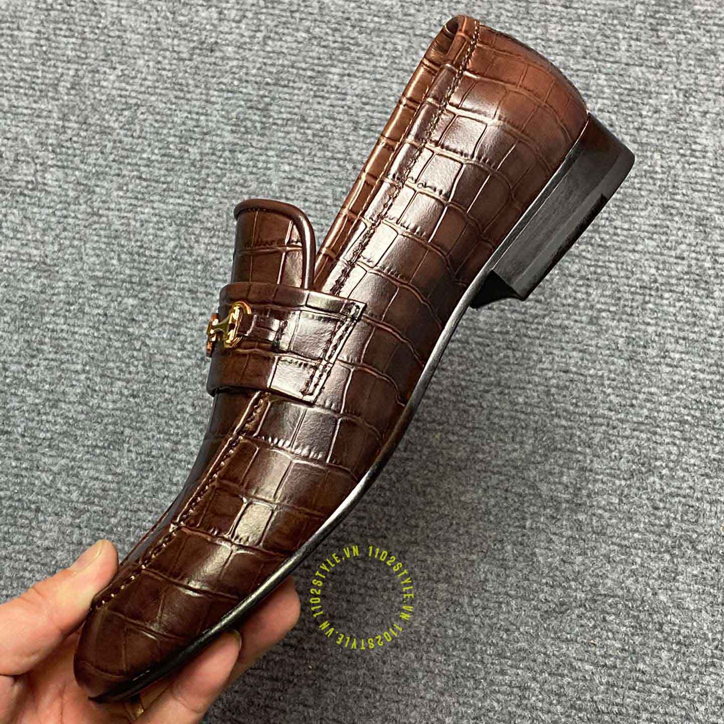 Ảnh chi tiết giày nam super fake Gucci Loafer màu nâu vân cá sấu nổi bật: