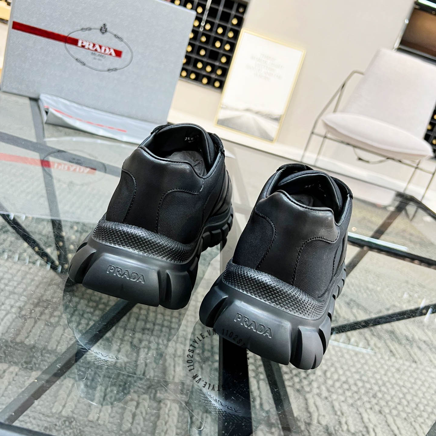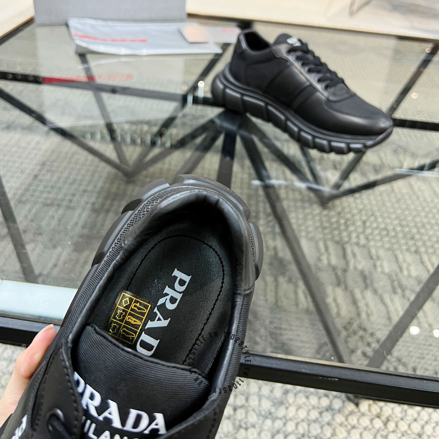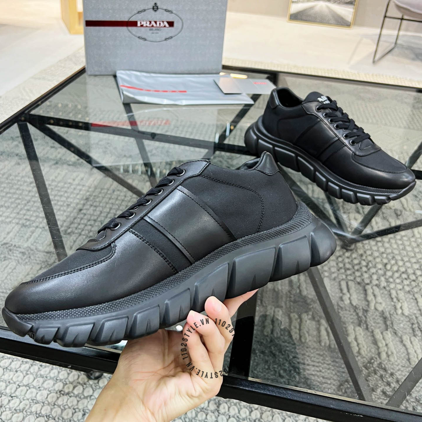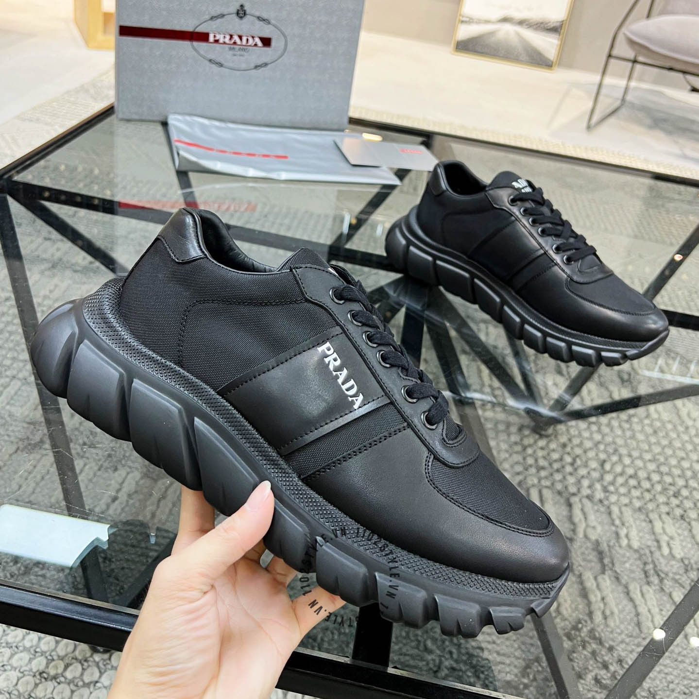 Ảnh chi tiết giày Sneaker Prada nam hàng hiệu màu đen da xịn phiên bản cao cấp:
