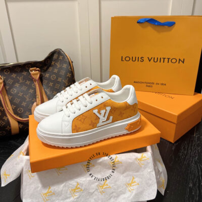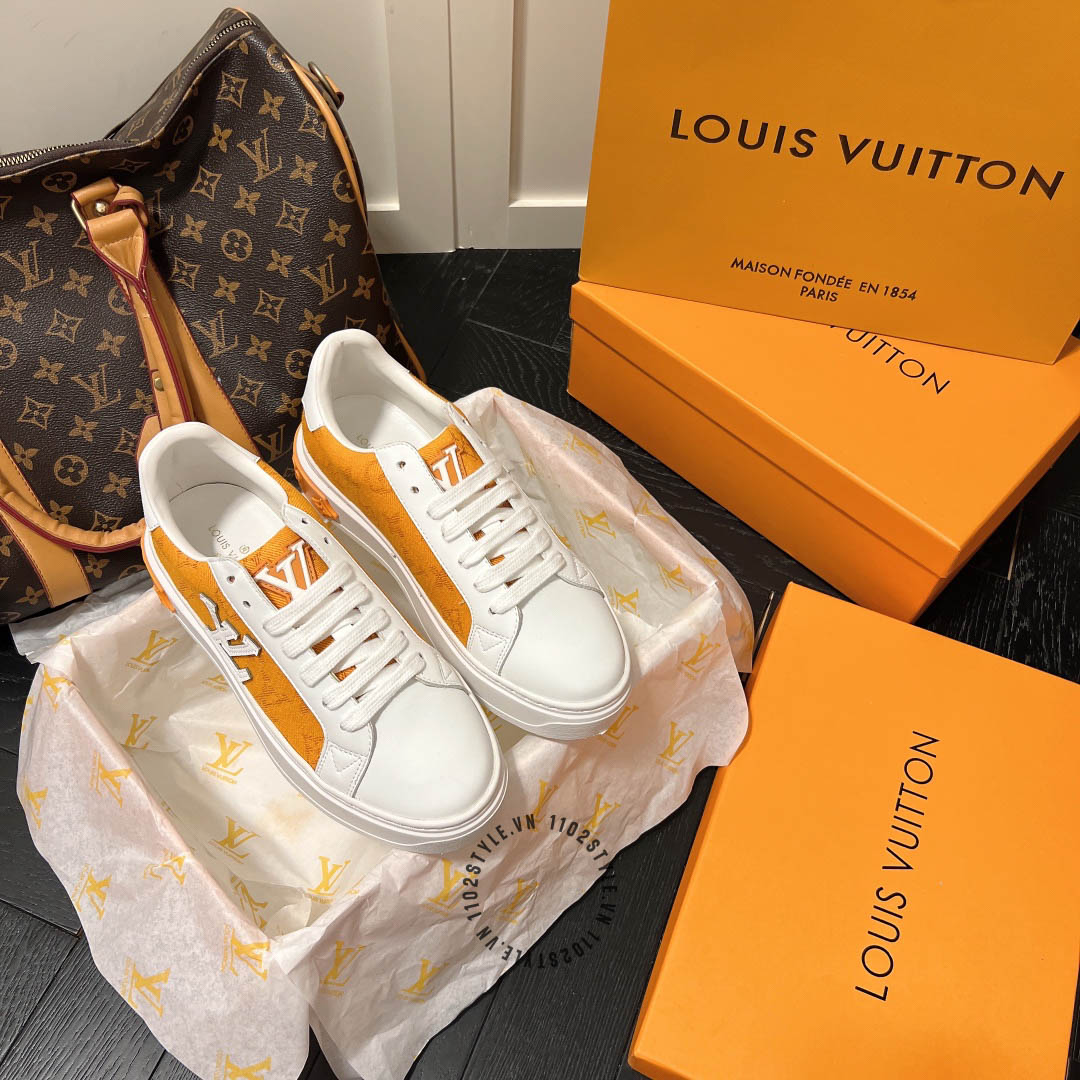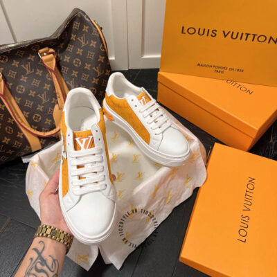 Hình ảnh chi tiết giày thể thao LV nữ da xịn màu trắng phối vàng họa tiết fake 1:1: