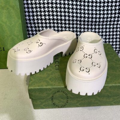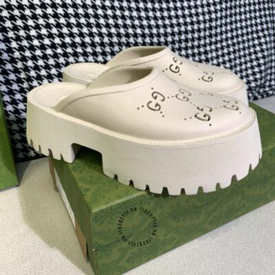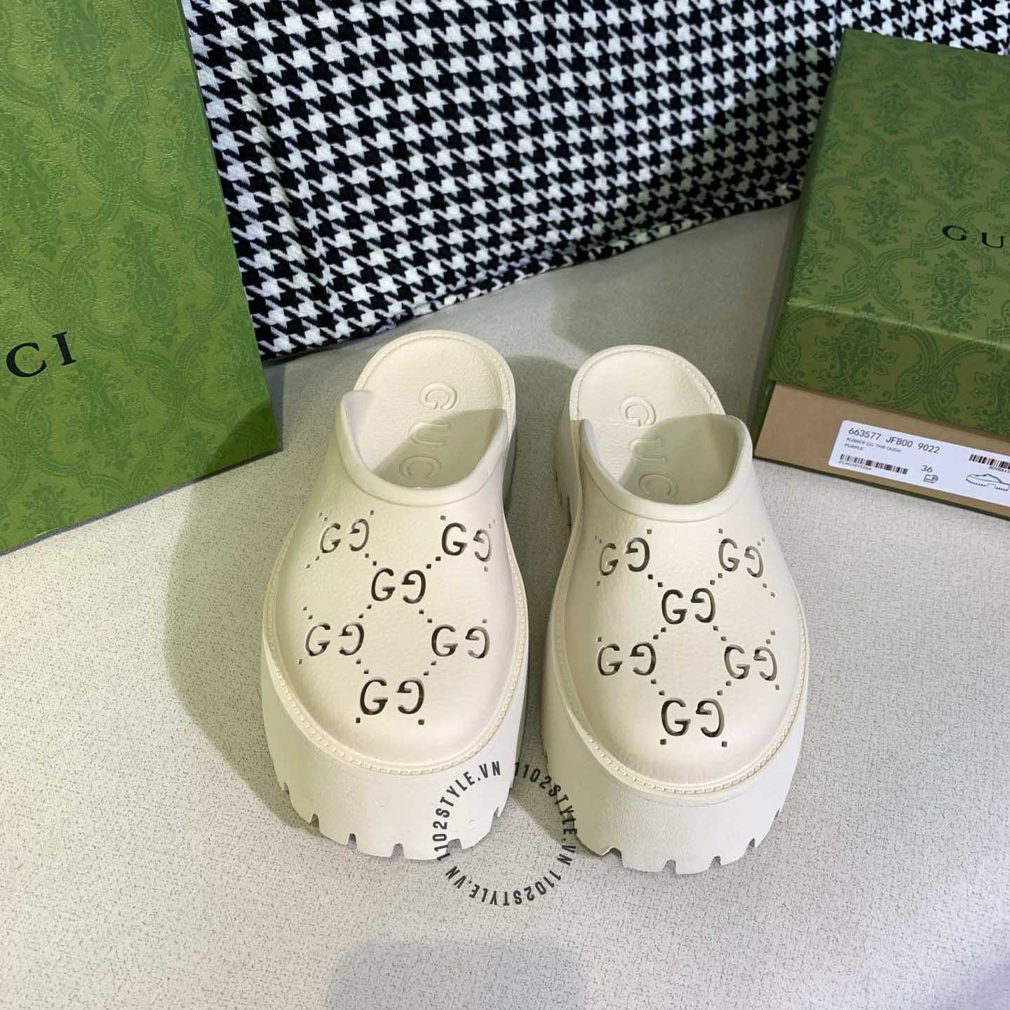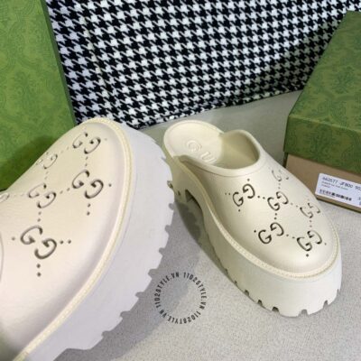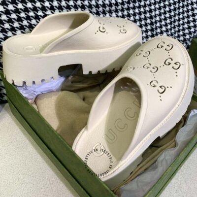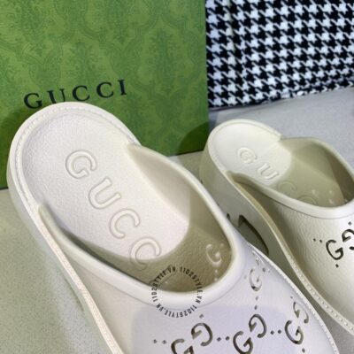 Hình ảnh sản phẩm sục cao su Gucci nữ màu be dập logo đế cao họa tiết fake 1:1 :