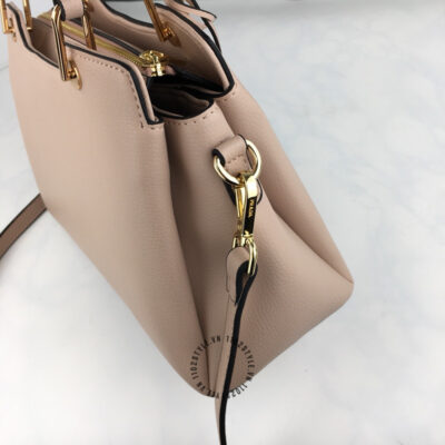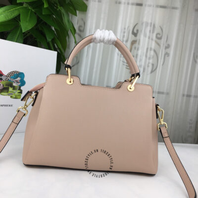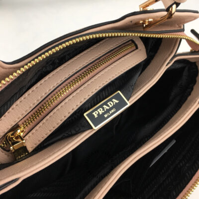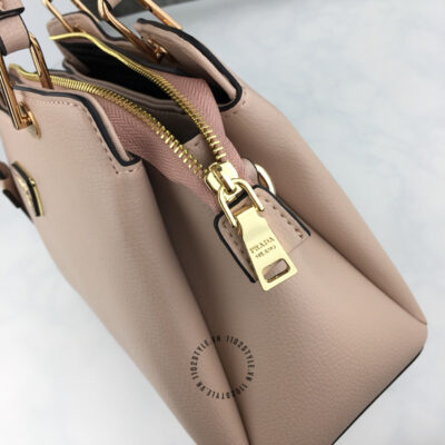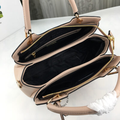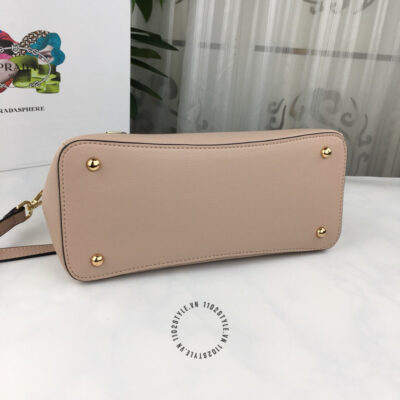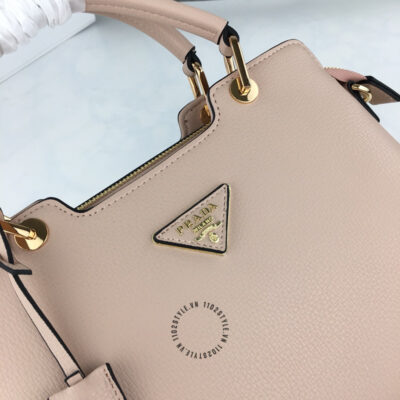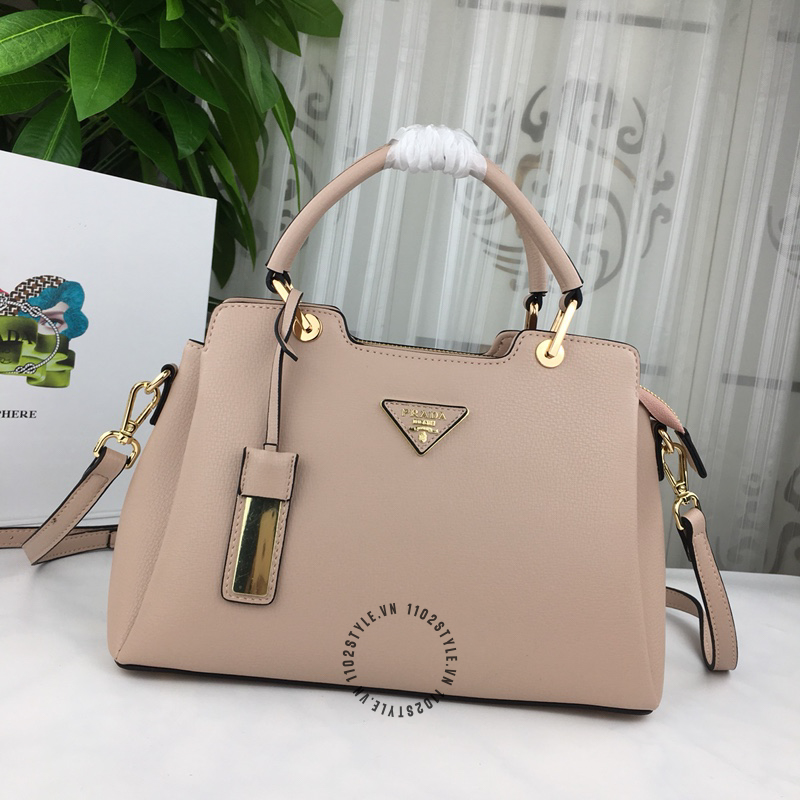 Hình ảnh mô tả túi Prada fake 1:1 nữ màu nâu nhạt logo tam giác khóa vàng: